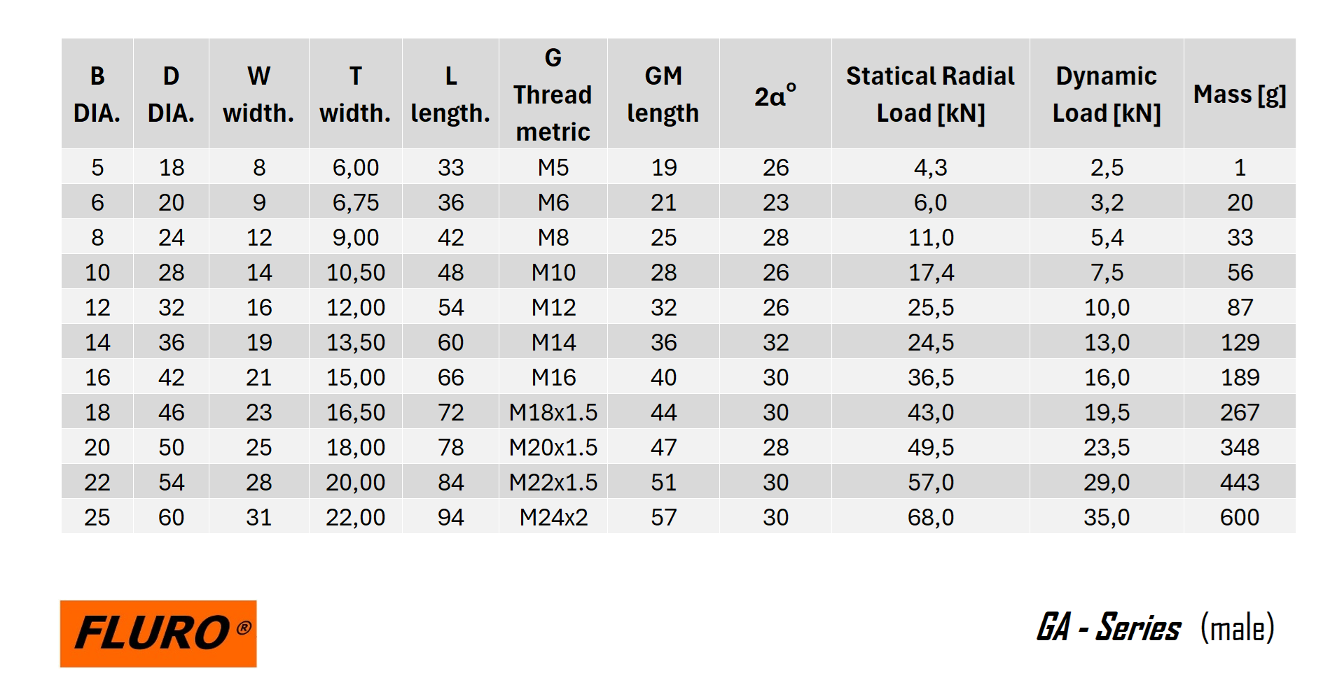 Seria GA - Główka cięgła z gwintem zewnętrznym ze stali automatowej lub stali do ulepszania cieplnego, ocynkowana, dosmarowywana przez wklęsłe kulkowe gniazdo smarowe.