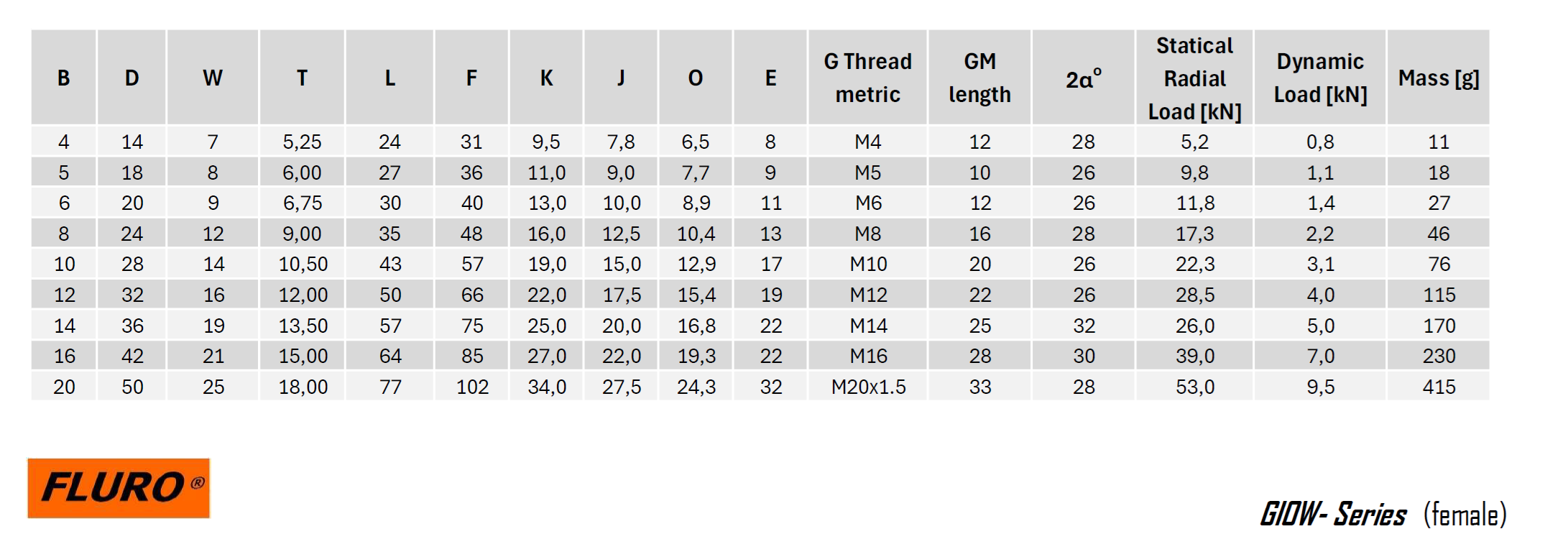- Seria GIOW - Główka cięgła z gwintem wewnętrznym ze stali automatowej lub stali do ulepszenia cieplnego, ocynkowana, bezobsługowa. Zastosowanie przy niewielkich siłach osiowych i niepełnym obrocie.