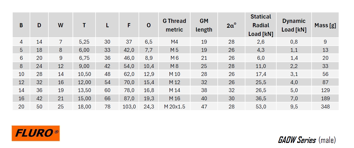 - Série GAOW – Cabeça de rótula com rosca externa em aço de usinagem ou aço temperável, zincada, isenta de manutenção. Indicada para baixas cargas axiais e movimento rotacional limitado.