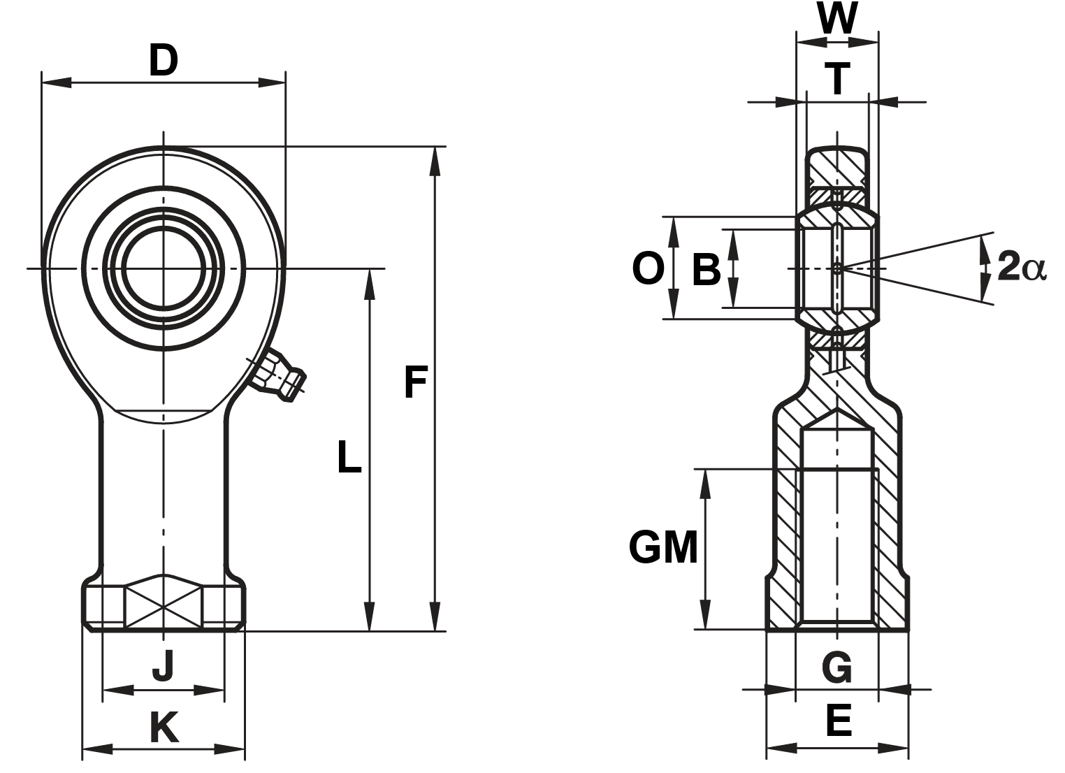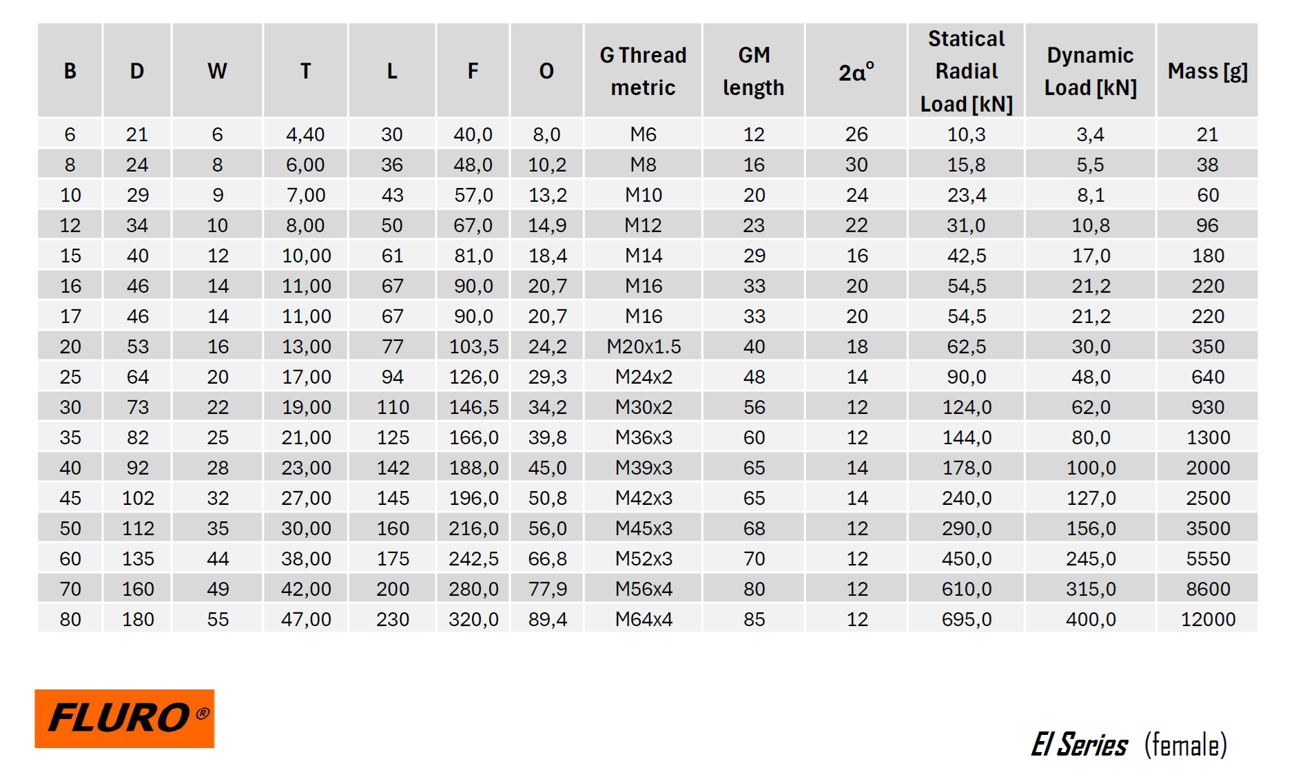 Série EI – terminal de rótula, série dimensional E com rosca interna, feito de aço de usinagem automática ou aço tratável termicamente, zincado, com mancal esférico aço/aço (requer lubrificação).